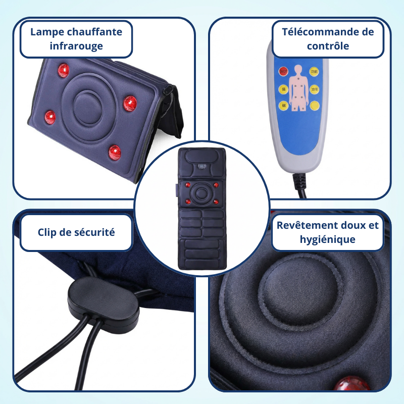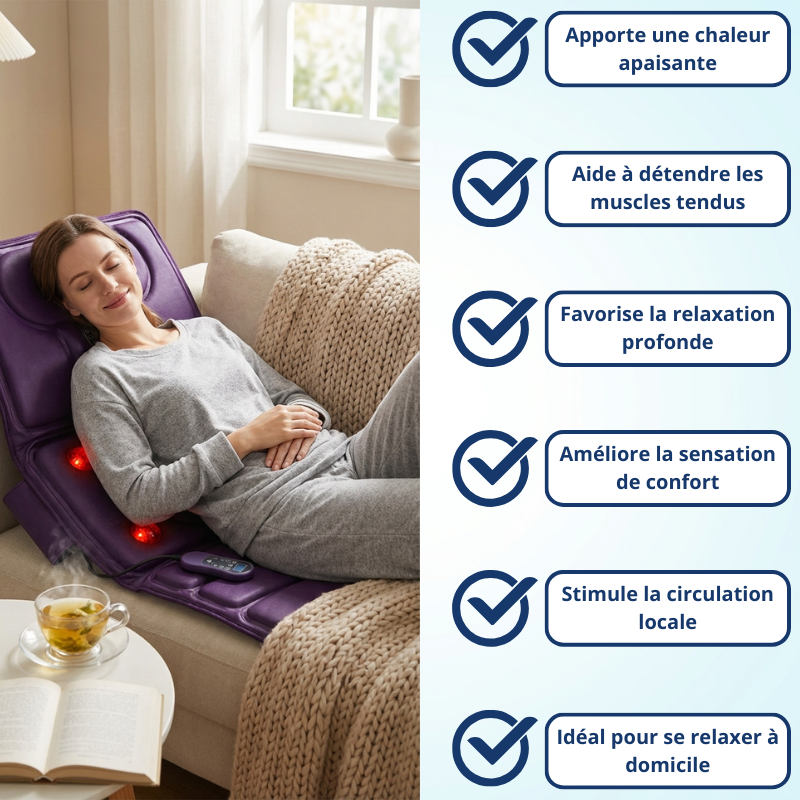 Un tapis de massage pensé pour le confort du dos, associant vibrations, massage par vagues et chaleur pour un moment de détente à domicile.